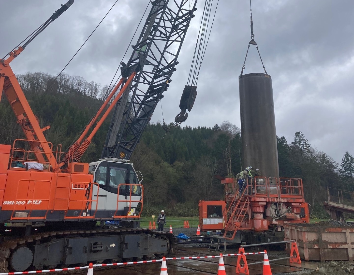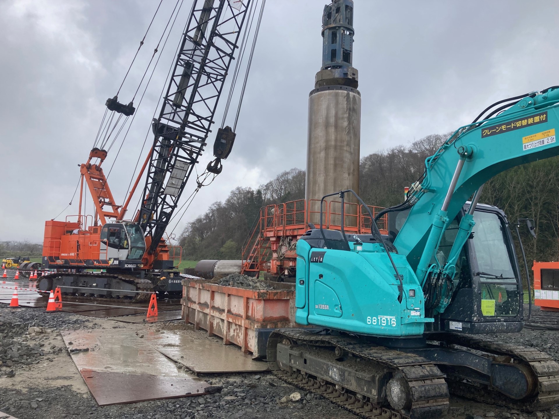 オールケーシング工法 ケーシング(鋼管)を全回転チュービング装置で地盤に圧入した後、ハンマーグラブを落下させることで中の土砂を掘削し、掴み取るように排出。掘削後に鉄筋籠を挿入し、ケーシングを抜きながらコンクリートを打設し、地中にて杭を形成する工法。 ケーシングの設置作業 ハンマーグラブによる掘削作業 搬送されてきた鉄筋籠の荷下ろし