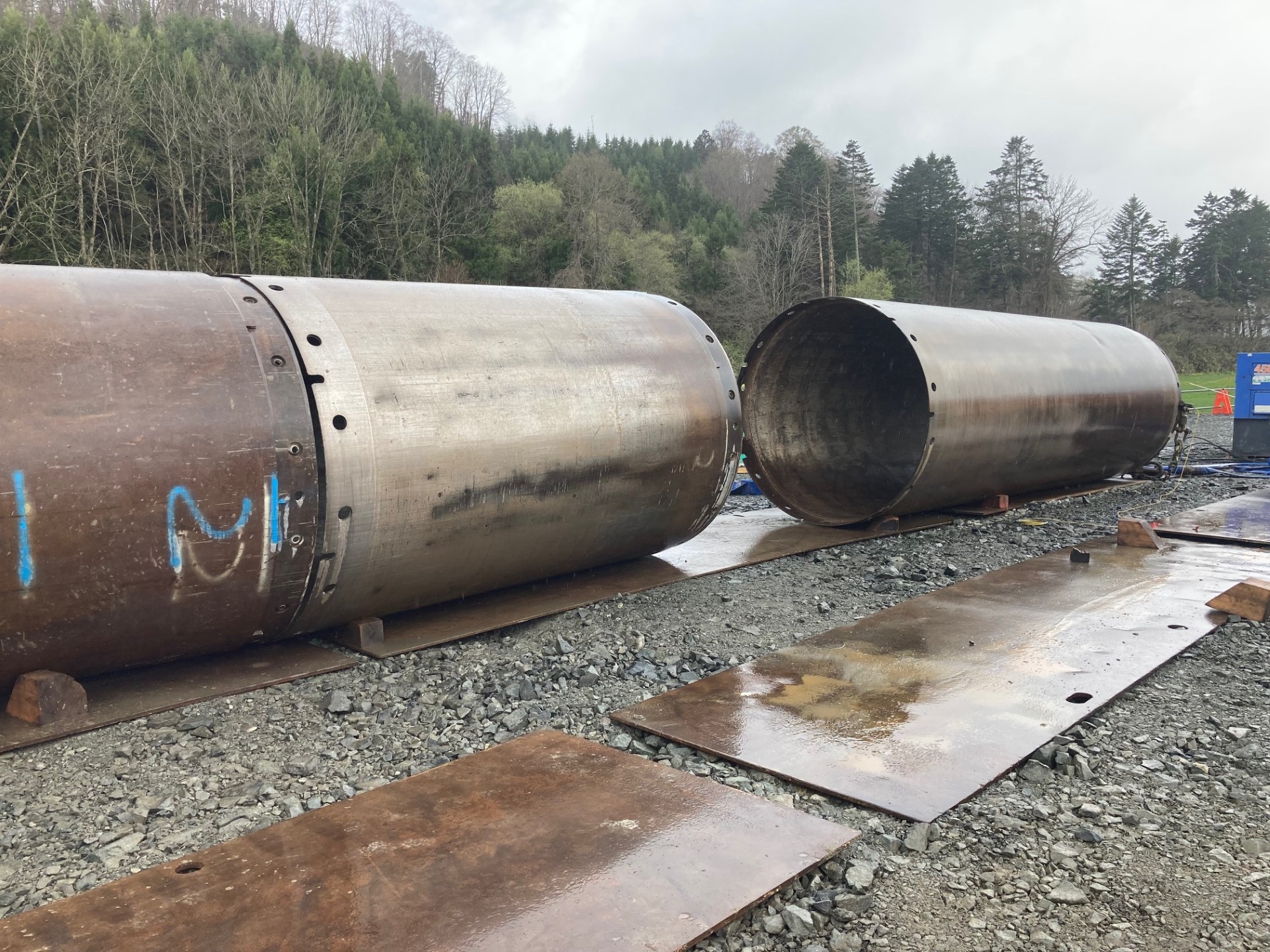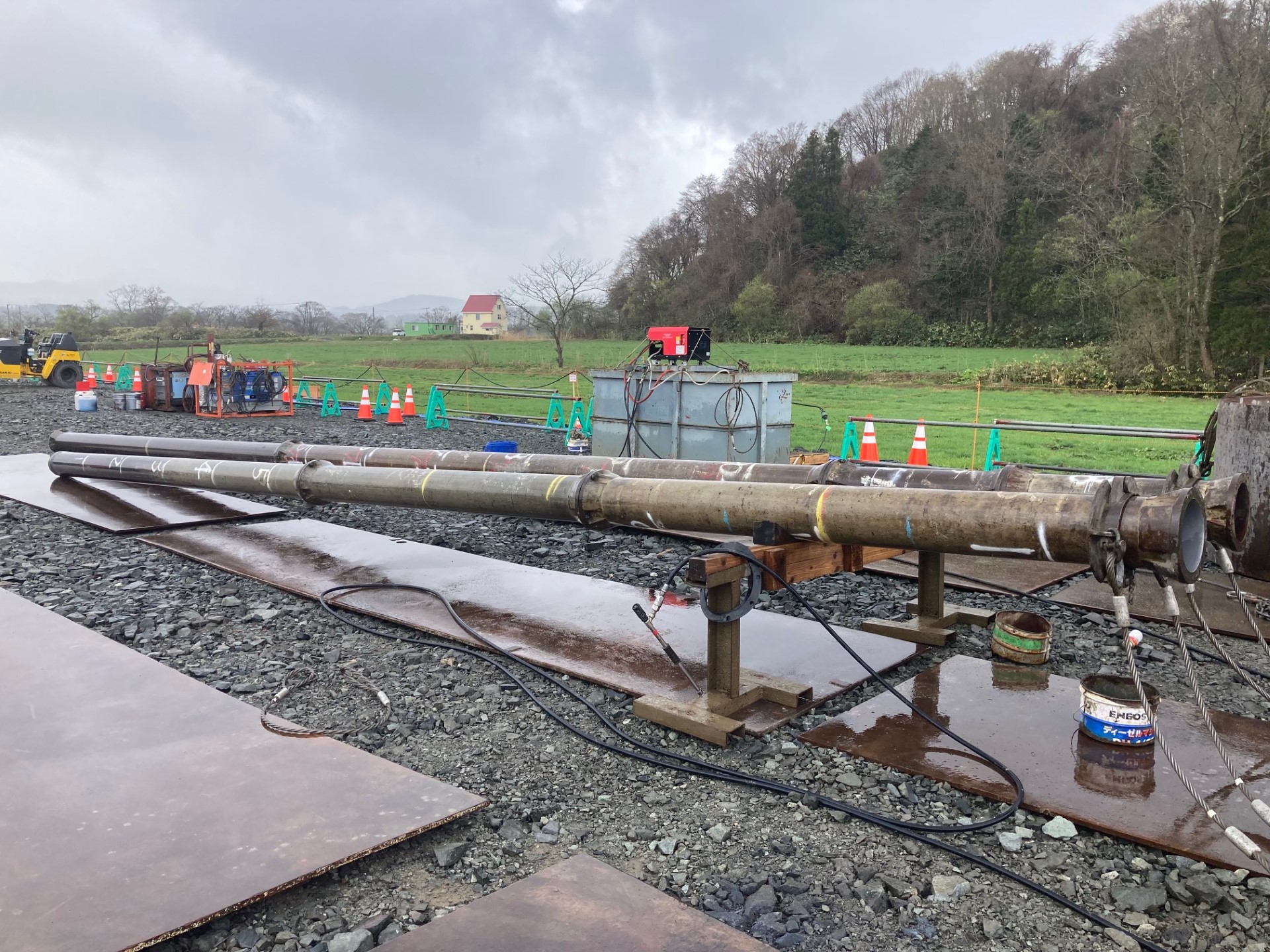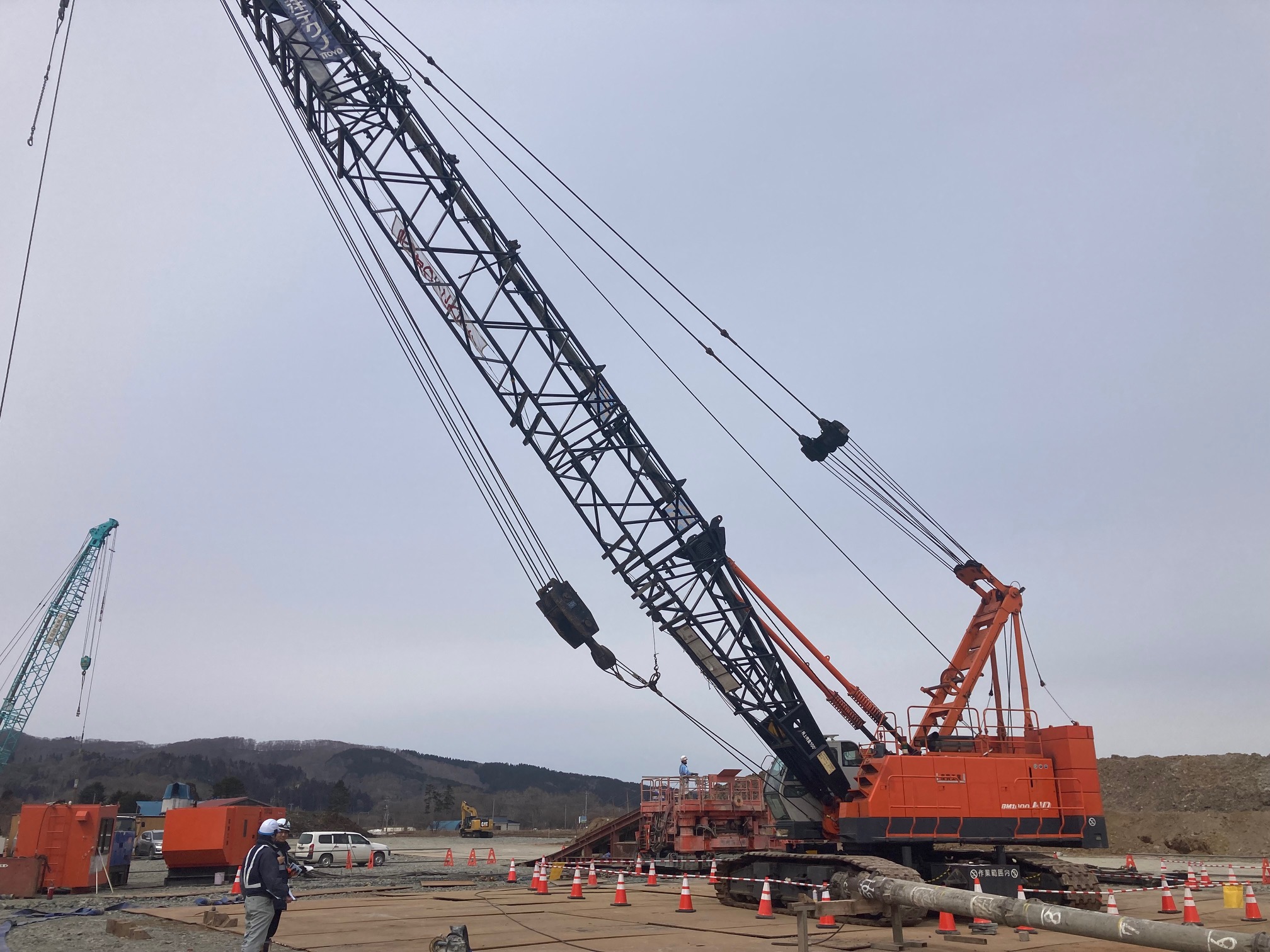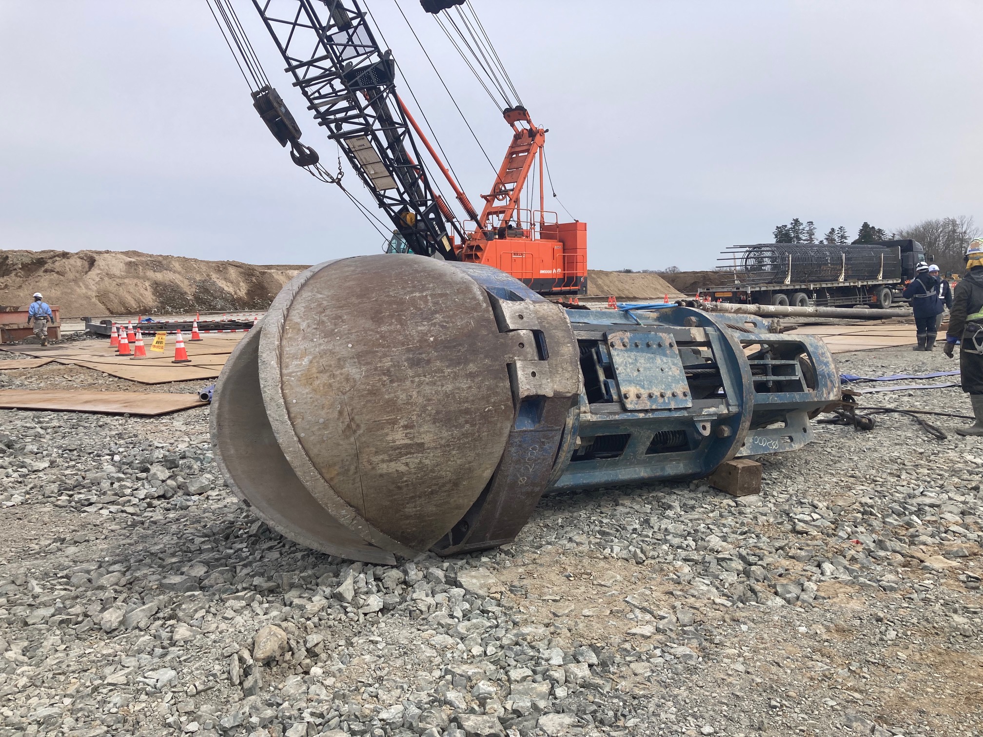機械・機材 クローラクレーン 100t(他5台) 全回転チュービング装置 φ2000(他4台) ケーシング(全回転チュービング装置にて地面に圧入) ハンマーグラブ(ケーシング内を落下させ土砂を掘削) トレミー管(コンクリート打設用配管)